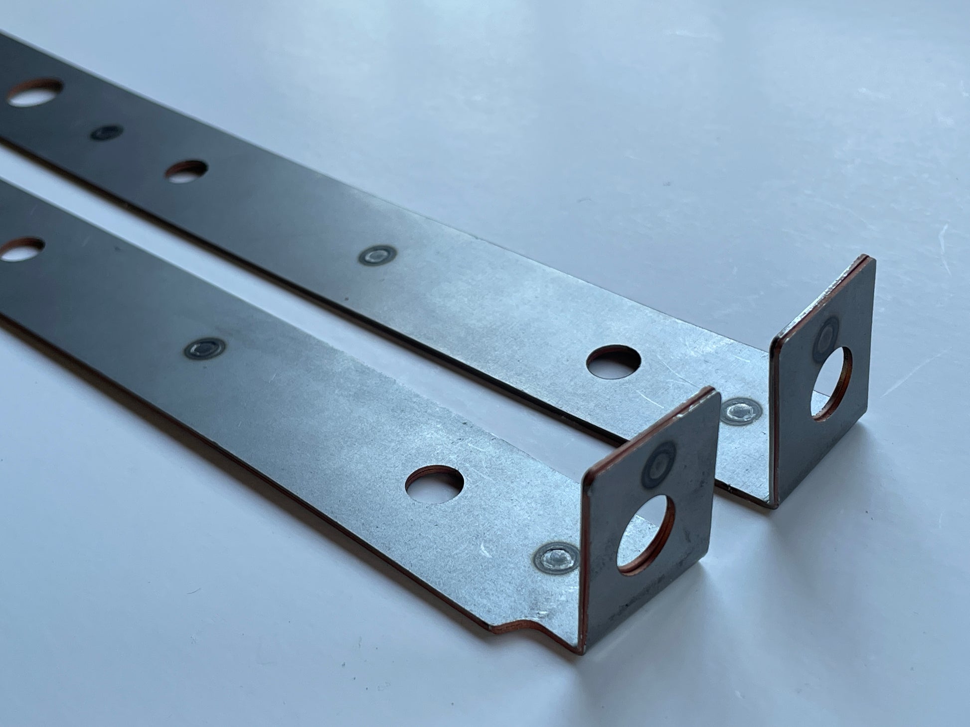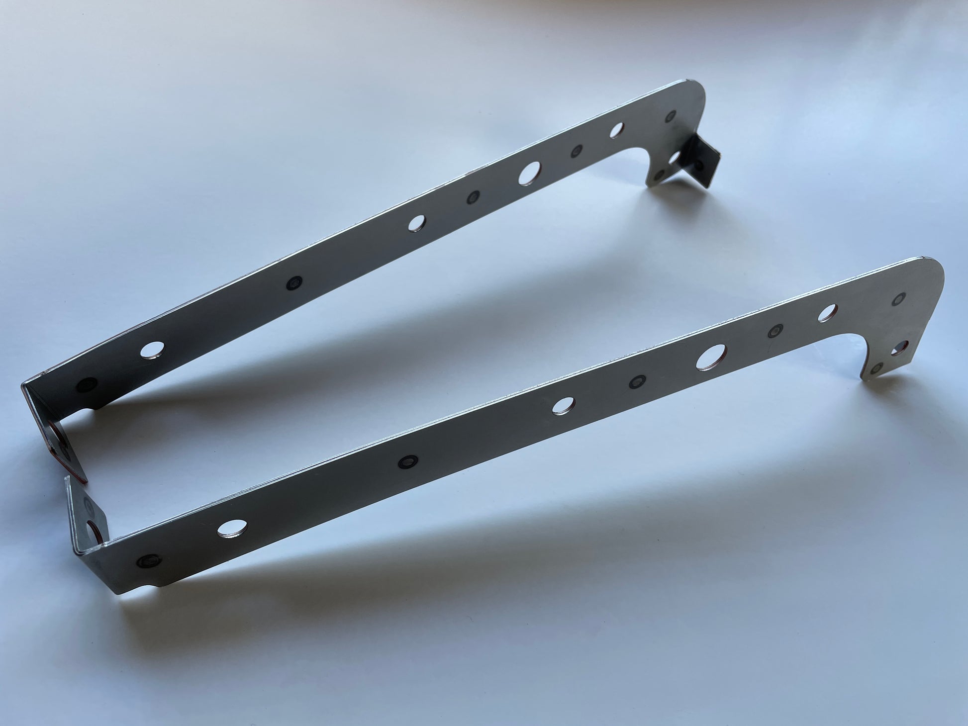 This is a brand new pair of the reinforcement doublers used on the lower rear inner section (where the mate to the running boards) of the front fenders for 1935, 1936, and 1937 Ford Pickups and Trucks. They are made exactly like the original pieces, including being double layered and spot welded. The surfaces between the panels have been sprayed with weld thru primer before being spot welded together. All bends, holes and profiles have been replicated from a good original. I have only done one short run of these so once they’re gone, they’re gone. These are sold in pairs, left and right. Made in the USA.