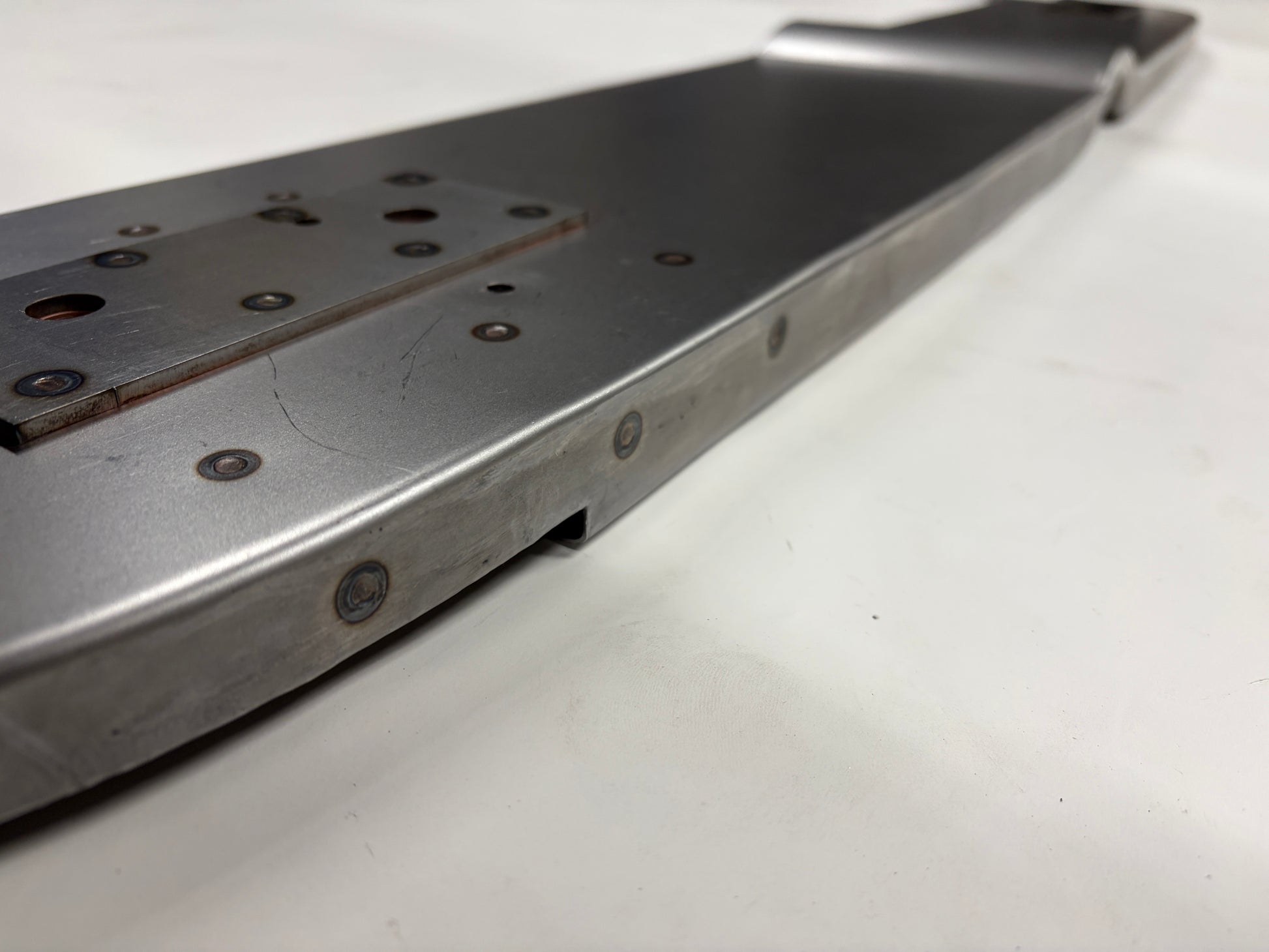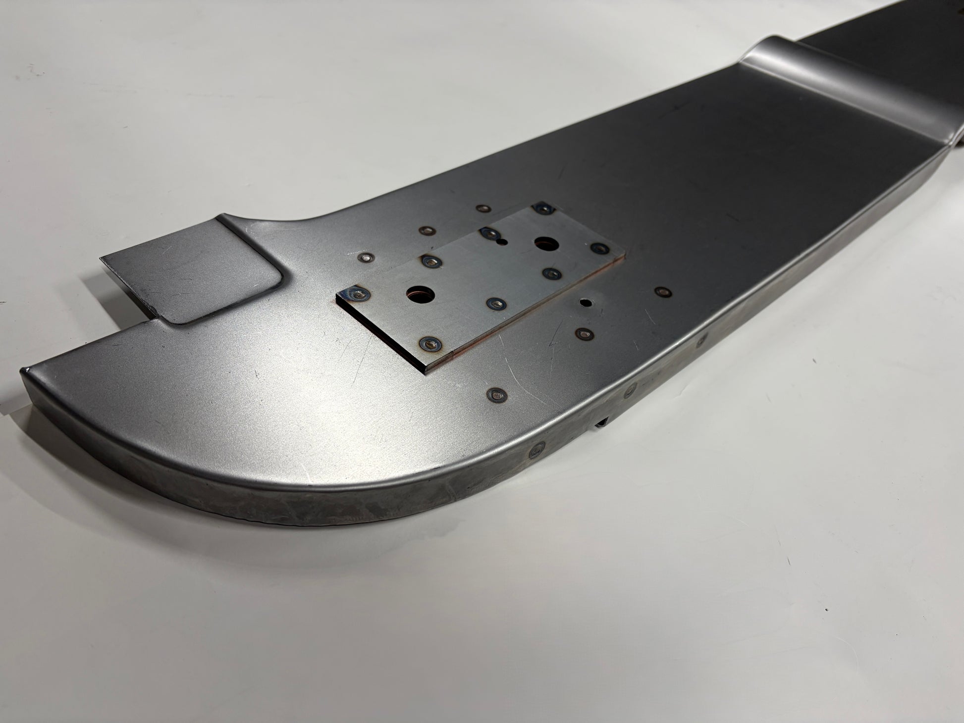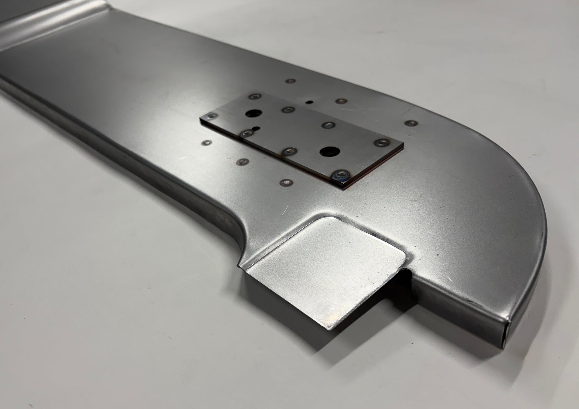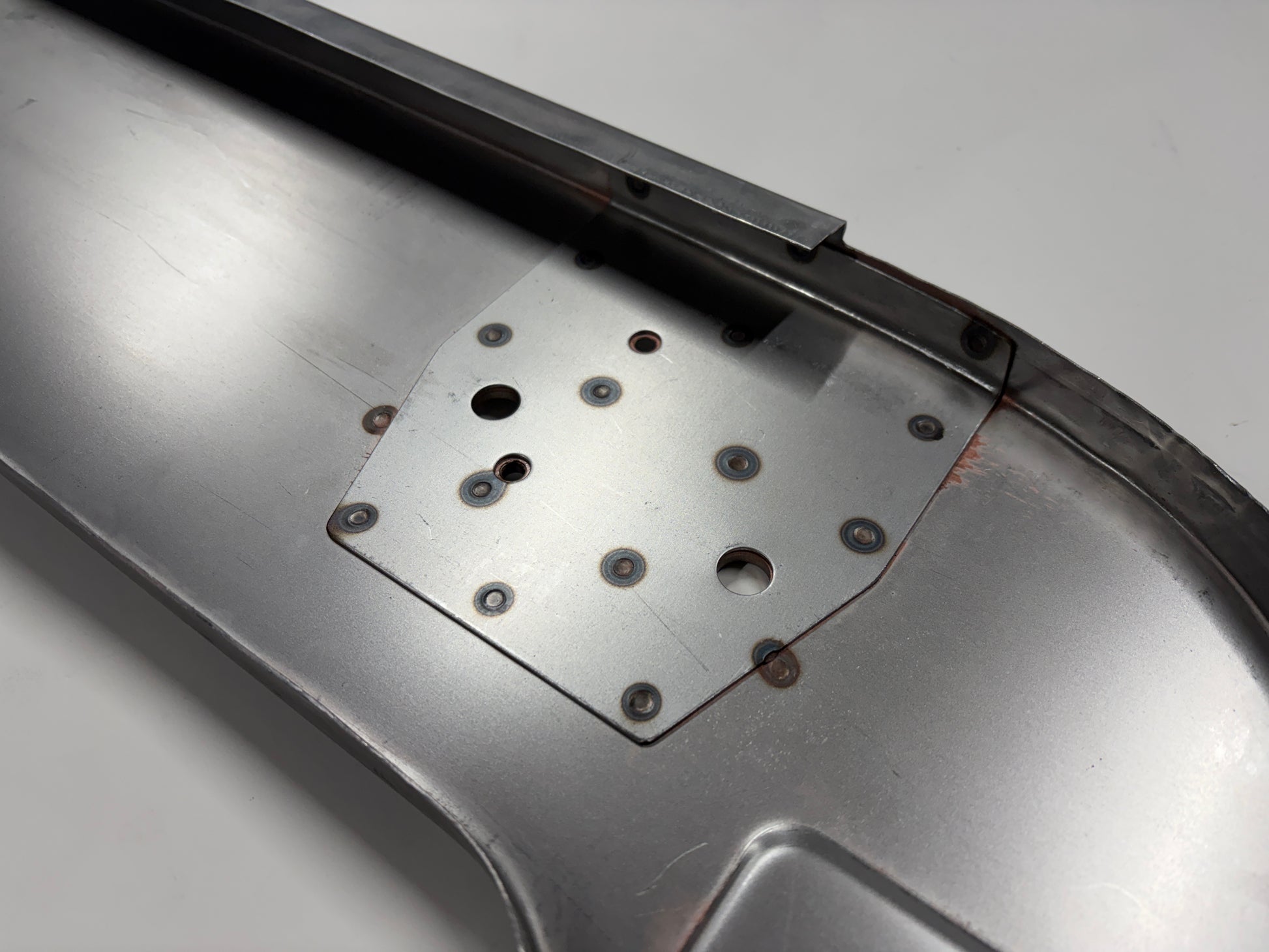 This is the rearmost floor panel and rear cab panel lower support for 1935, 1936 and 1937 Ford Pickup and Truck cabs. I believe this is also the same panel that will fit 1938 and 1939 cabs as well but please confirm before ordering. The panel is the full width panel and is complete with the inside and outside rear cab mounting reinforcement plates, already spot welded in place. Prior to spot welding, each panel was prepared and treated with a weld thru primer to prevent corrosion between these overlapping panels. Formed from 18 gauge cold rolled steel.